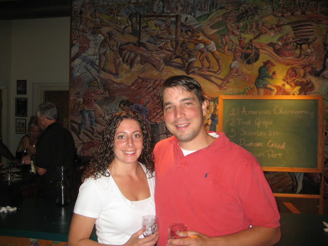 Onto the tasting! We had over 40-50 people in our group. It was a huge group and hard to maneuver around, but the bar area went across the whole back of the gift shop so we all fit. We even got to keep the wine glasses as souvenirs.We got to try 5 different wines.You can see the list of wines behind us. Here is an interesting fact. The only grapes they grow on the property are for the Pinot Grigio. They import other grapes from Georgia and California. That was a little disappointing to me, but guess I'll have to make it out to California wine country one day. David enjoyed the Port, which is a dessert wine and we tasted it with chocolate. We brought home their best seller, a Summer sweet wine, and the Pinot Grigio.