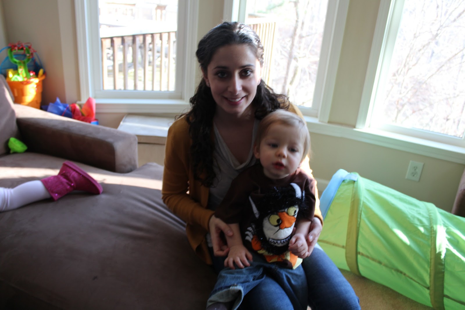 My sister got Max these awesome Where the Wild Things are sheets for when he is a big boy and gets a twin bed (sorry about Molly's behind). They are from Pottery barn when they had this theme, but I went on there one day to see if they had them still and they were on sale! But when I tried to buy them it said sold out, so my sister went back the next day to try and it worked! She surprised me and we're excited to keep the theme going as we really haven't set his room back up since we moved. We plan to keep it through his toddler days.